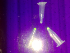 BL-21 細胞后,在平皿中用IPTG誘導長出菌苔,但未出現單菌落,可能的原因有:(1)菌液沒有涂開;(2)涂完后未先正放1h使菌液充分被LB吸收;(3)平皿上有水珠,未除去;(4)搖菌時間過長,菌過多。**后經過IPTG誘導表達,本組中未有一管表達成功,僅有老師的兩管表達出綠色的熒光蛋白,表達量很低,可能的原因:(1)在轉化過程中,由于操作不當,使重組質粒本身轉化進入