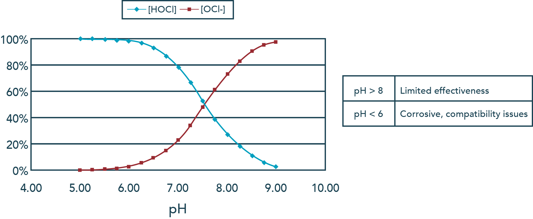 氯可以作為游離氯或氯胺存在。兩組都可以氧化化合物并實(shí)現(xiàn)治療目標(biāo),但是,需要更多的氯胺來滿足相同的氯需求。游離氯測量分別考慮水中的離子形式和質(zhì)子化形式的氯,OCl-和HOCl。在這兩者中,HOCl(次氯酸)是更強(qiáng)的氧化劑,并且在7.5的pH下是主要的。